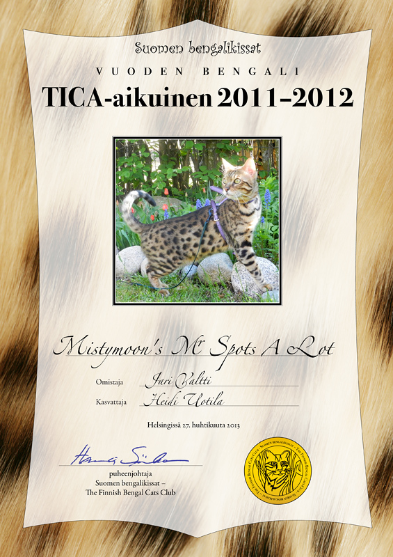 TICA-kauden 2011-2012 paras aikuinen: SGC Mistymoon'r Mr Spots A Lot
